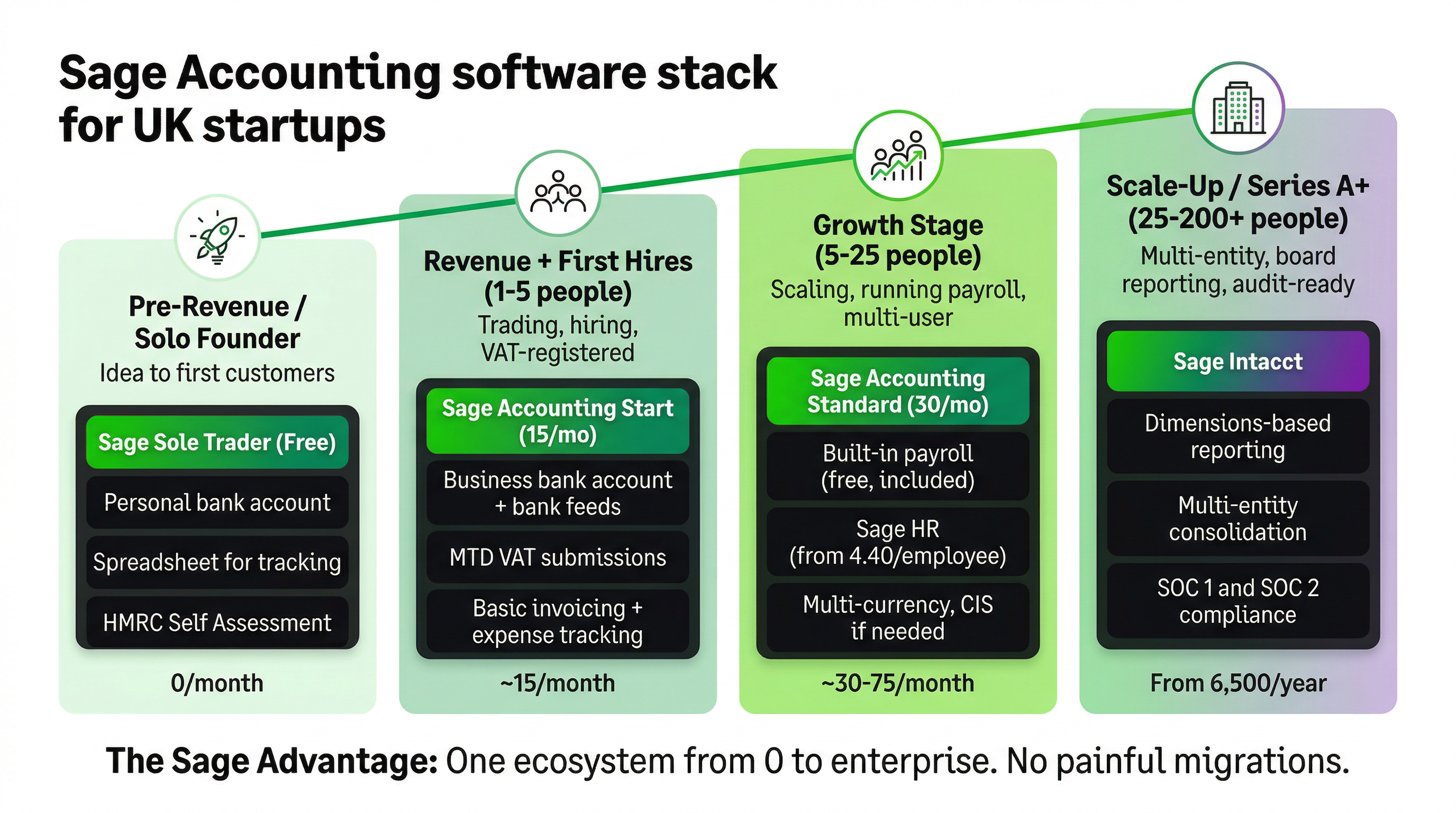 Sage's biggest advantage for UK startups is the breadth of its product range and the fact that you can move between plans without switching platforms or migrating data. The Sage pathway for a growing UK startup looks like this: