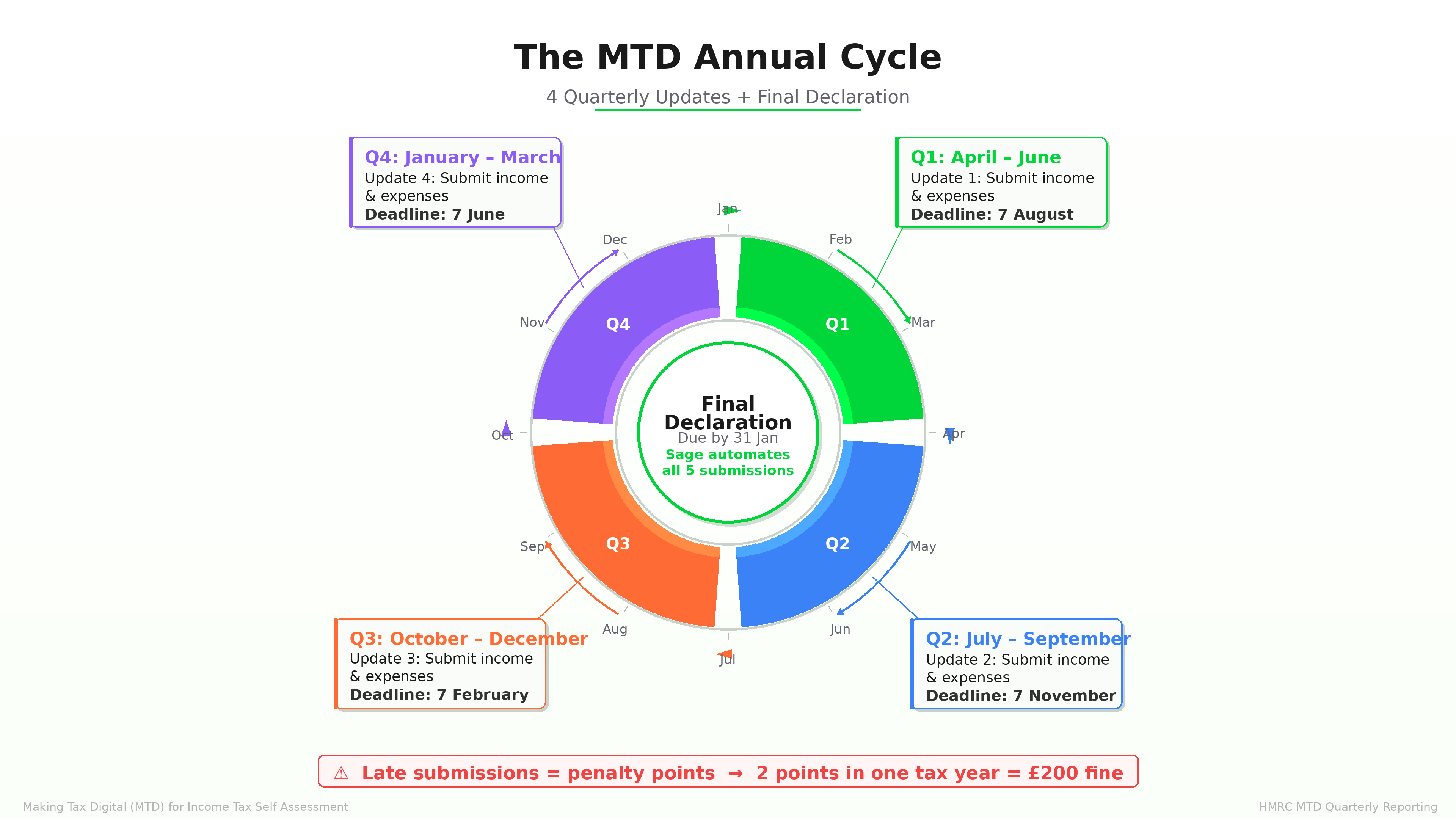 April 2026: Mandated for £50,000+ combined income from self-employment and/or property. April 2027: Extended to £30,000+ income. You must use HMRC-approved software to keep digital records and submit 5 times per year (4 quarterly updates + 1 final declaration). Penalties apply for late or non-compliant submissions.