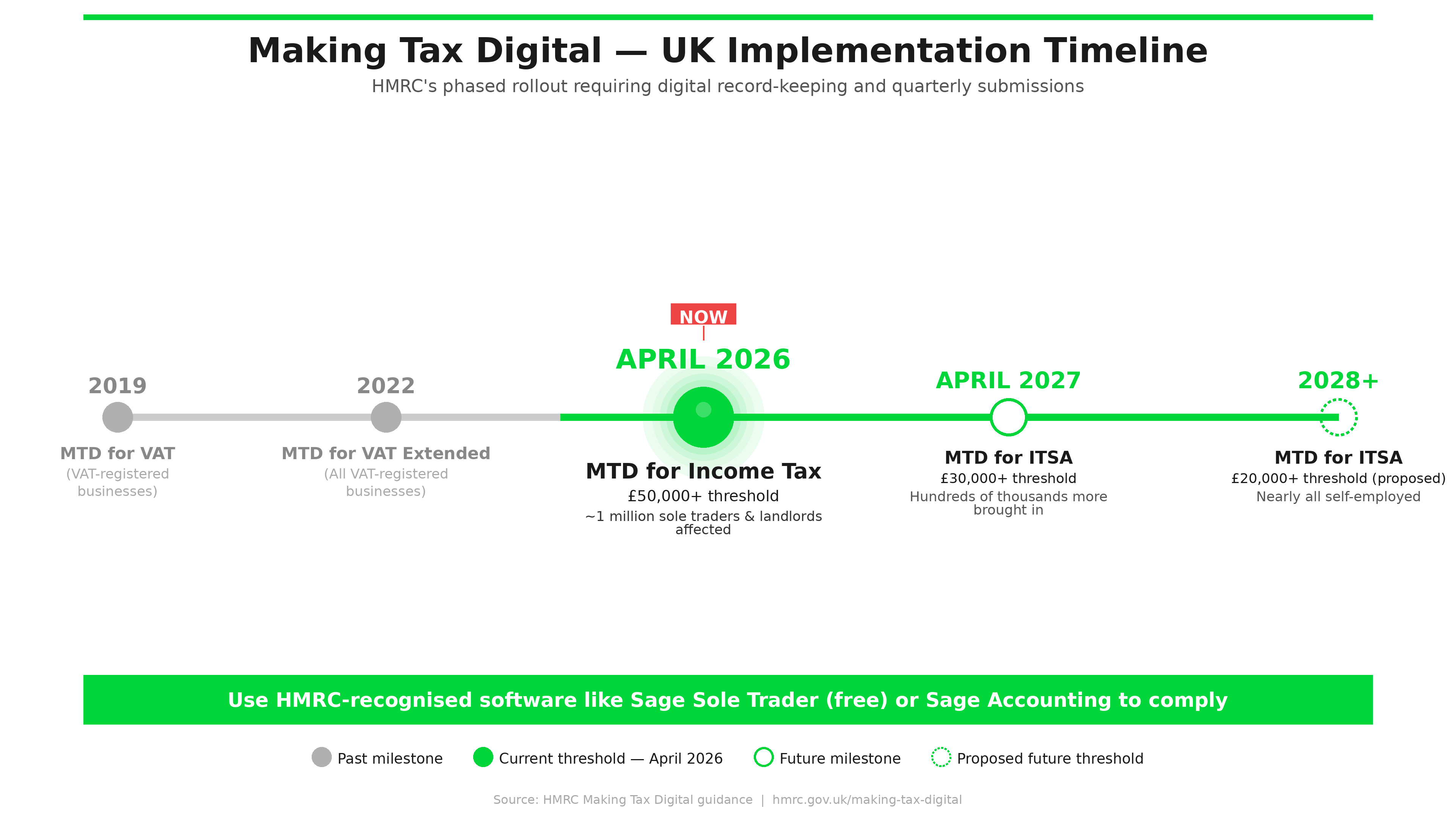 The April 2026 go-live date is firm. After years of delays and consultations, HMRC is rolling out MTD for ITSA in phases, and the first wave — affecting individuals with combined self-employment and property income over £50,000 — arrives this year. If you are in scope, you need to be using compatible software, keeping digital records, and making quarterly submissions by April 2026. The time to prepare is now, not in the months before the deadline.