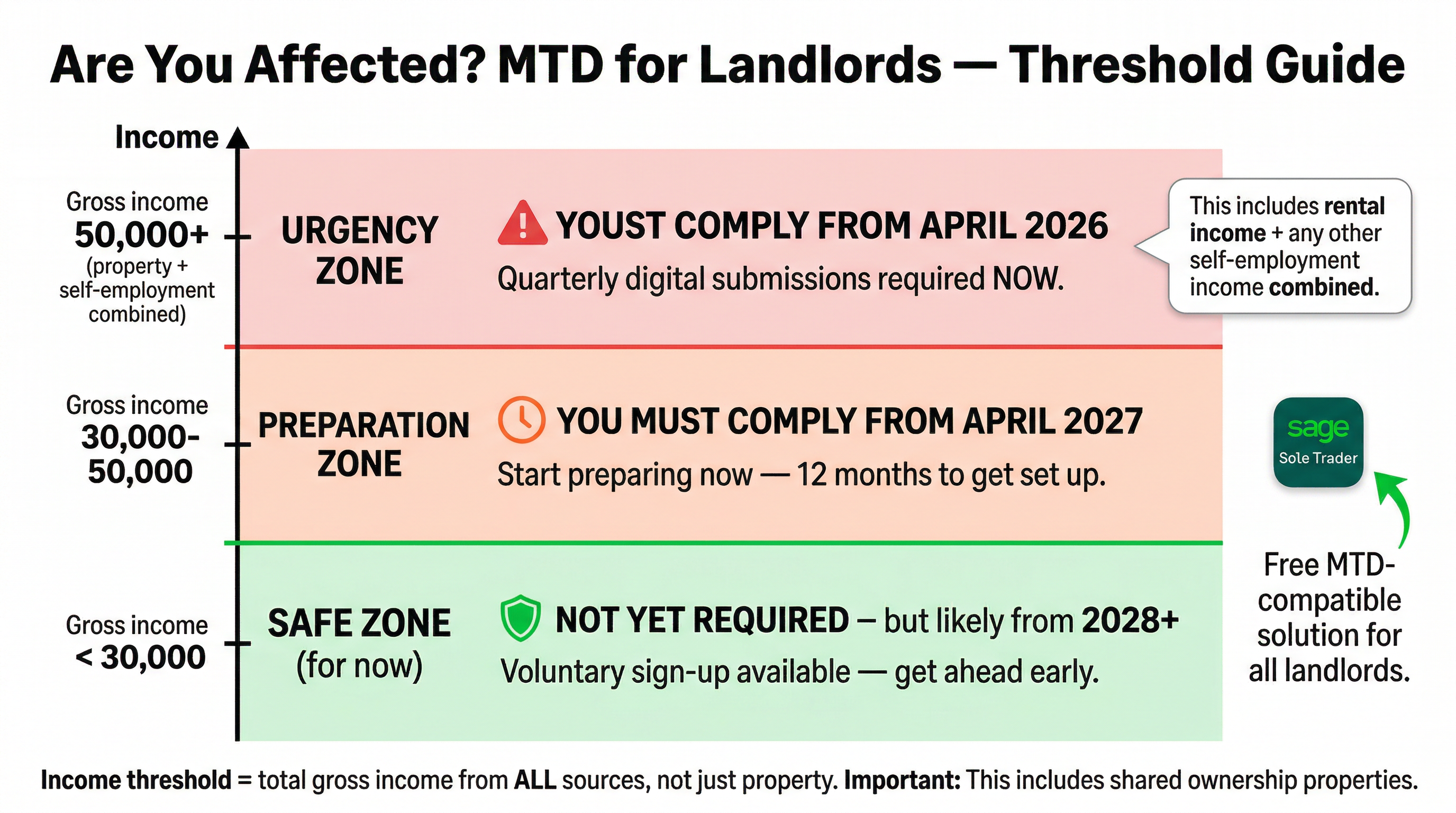 If your gross property income exceeds £50,000, you have a firm deadline and the worst outcome is non-compliance penalties. The practical steps to take now are straightforward: open a dedicated landlord bank account if you do not already have one (mixing property and personal finances makes reconciliation significantly harder), start recording income and expenses digitally even before your software is fully configured, and sign up for Sage Sole Trader or your chosen MTD tool well before the April 2026 start date to allow time to learn the system and connect your bank feeds.