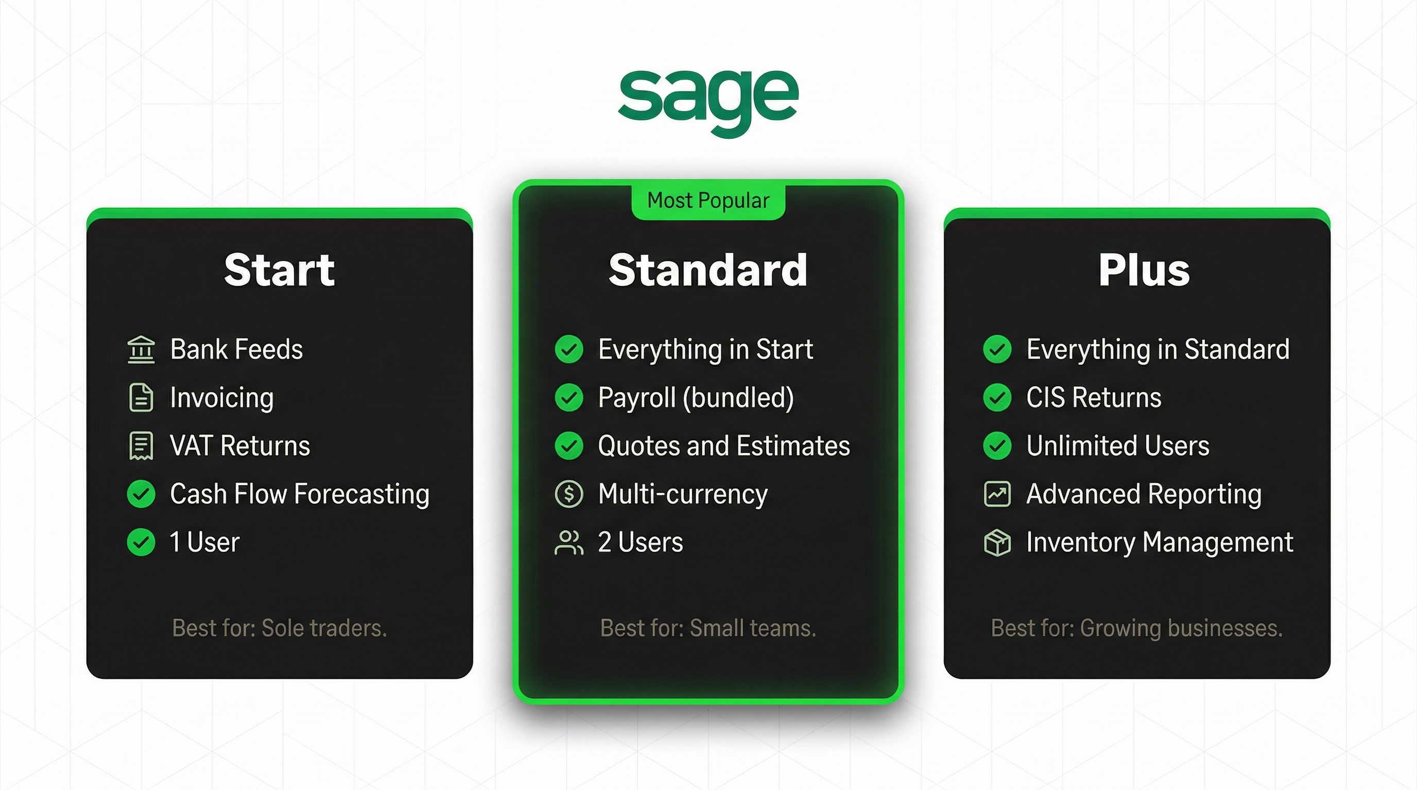 Sage Accounting is structured into three plans, each building on the one below it. The naming is straightforward — Start, Standard and Plus — and the price jumps reflect meaningful capability additions rather than artificial tier padding.