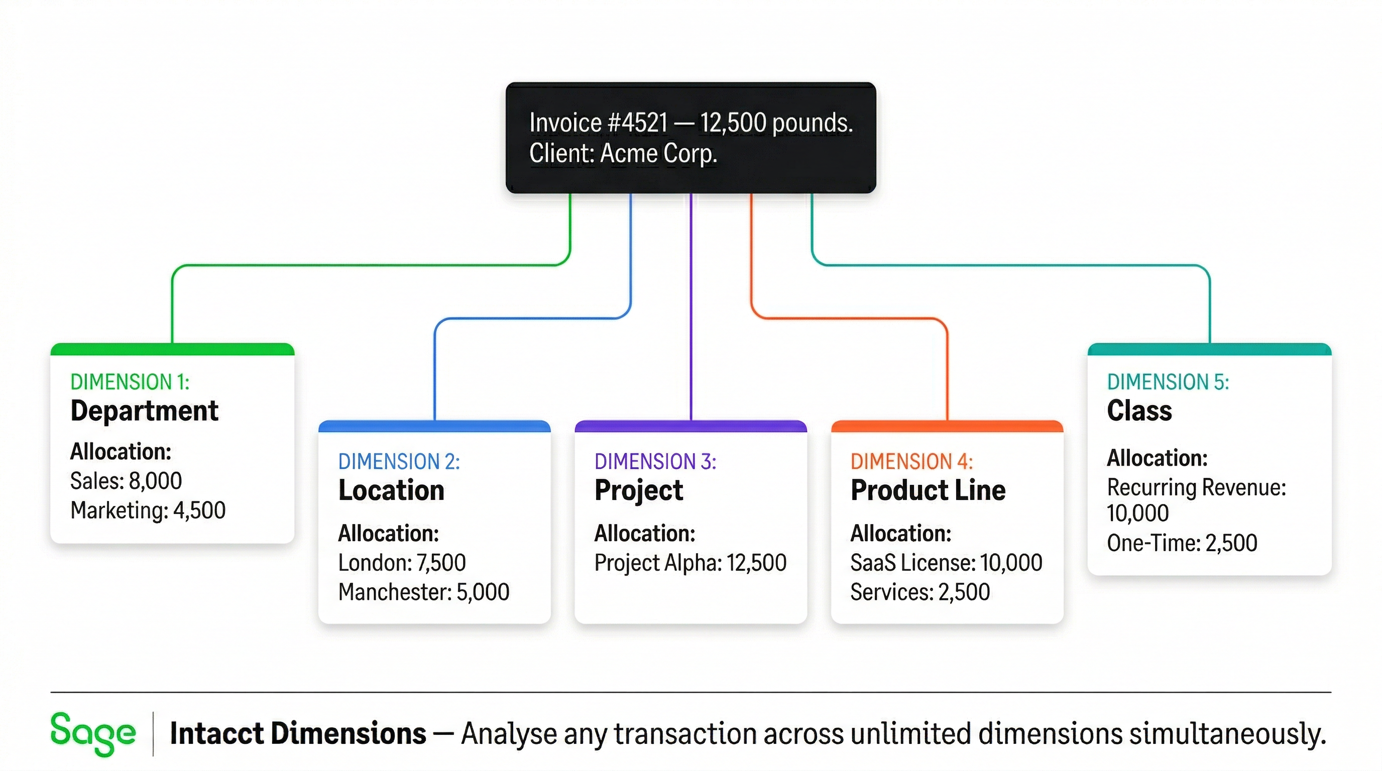 Unlike Sage Accounting (previously Sage Business Cloud Accounting), which is designed for sole traders to small businesses, Intacct is built on a fundamentally different architectural philosophy. At its core is a multi-dimensional chart of accounts that lets finance teams slice and analyse data across unlimited dimensions — department, location, project, fund, class, or any custom dimension you define. This approach renders traditional account code proliferation obsolete and enables genuinely sophisticated reporting without manual consolidation work.