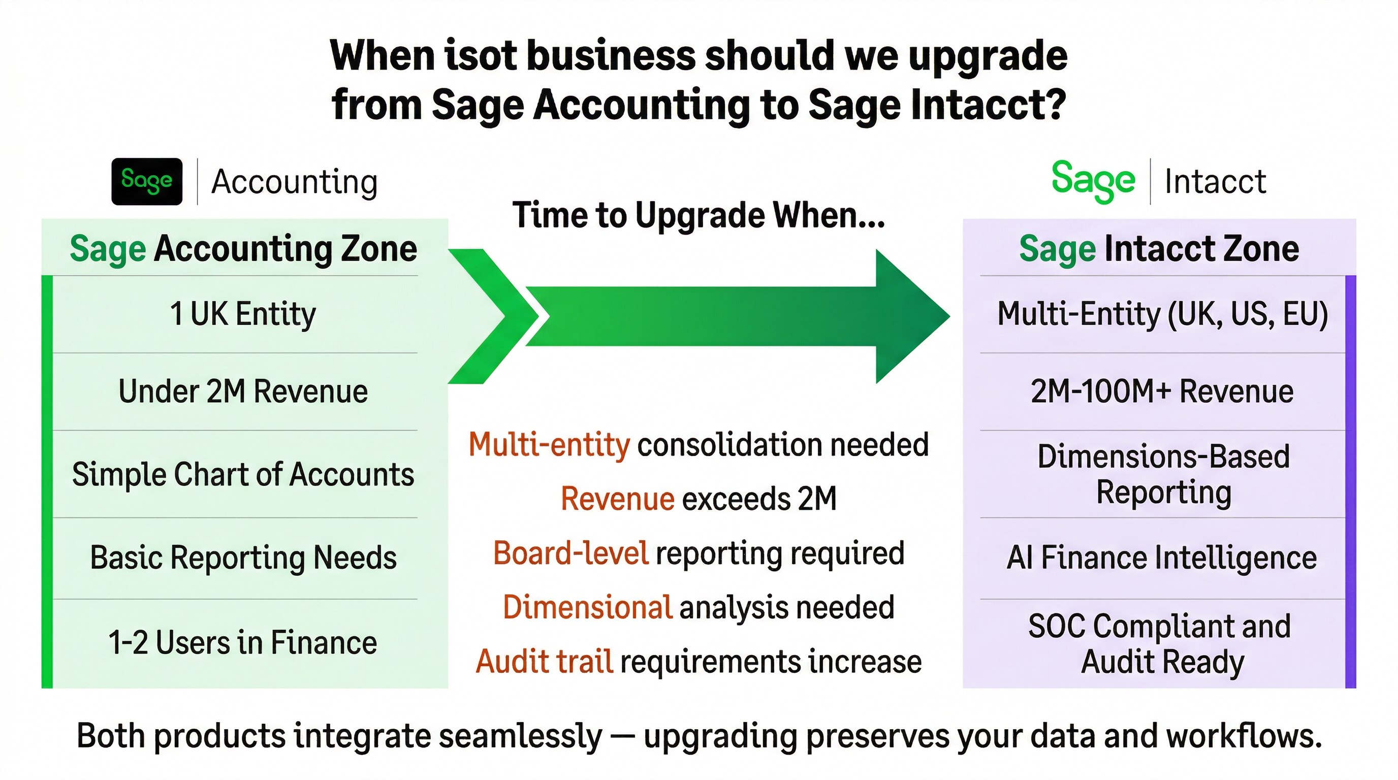 You operate as a single legal entity with straightforward financials and your current close cycle is manageable. Sage Accounting Plus at £59/month delivers excellent value for growing SMEs, and the jump to Intacct represents a major step in cost, complexity, and implementation burden. There is no shame in staying at the right level for your current needs.