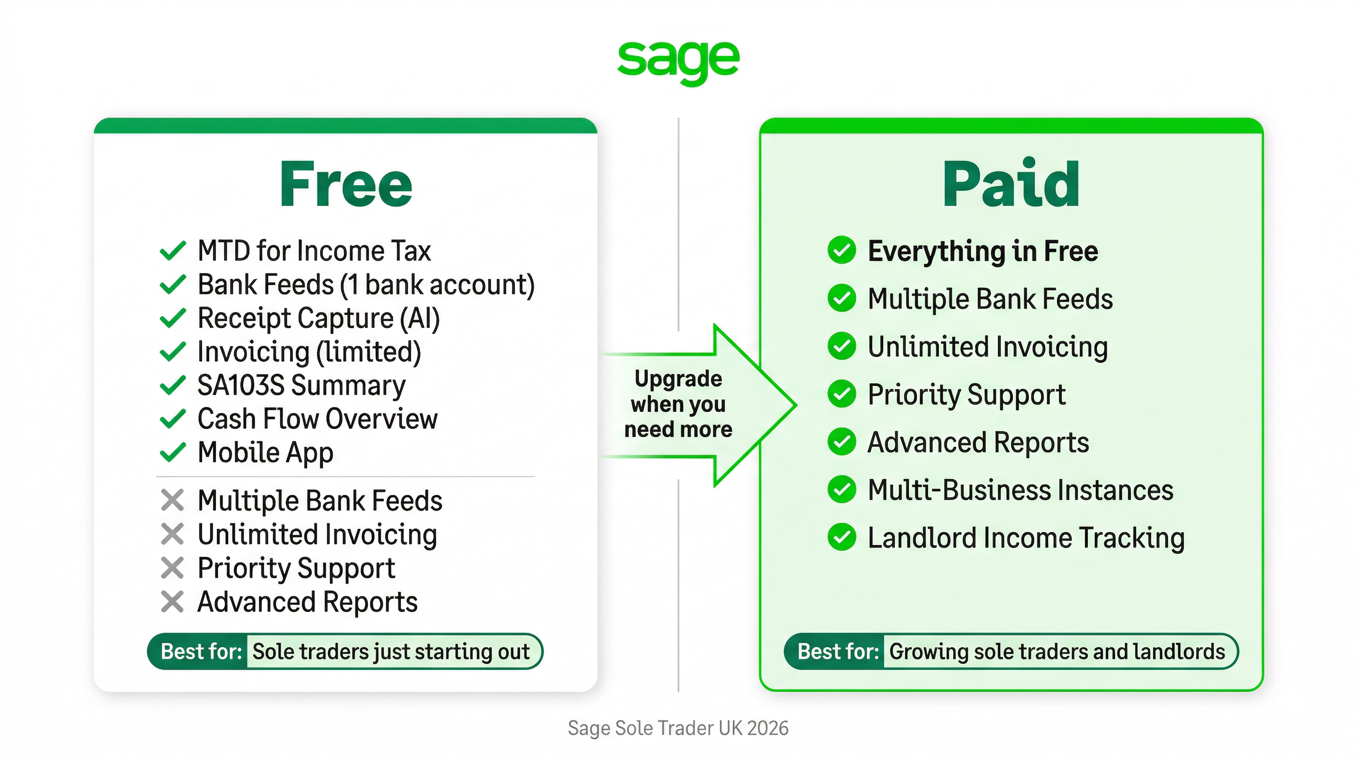 A comprehensive review of Sage for Sole Traders — comparing the free and paid plans, MTD for Income Tax compliance, AI-powered receipt capture, bank feed automation, quarterly HMRC submissions, SA103S summaries, and who should use each plan.