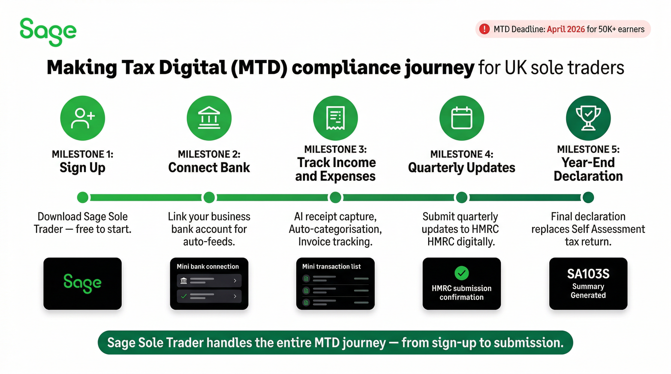 From April 2026, sole traders and landlords with qualifying income (initially those with income above £50,000, extending to lower thresholds in subsequent years) must use MTD-approved software to keep digital records and submit quarterly updates to HMRC. A spreadsheet or paper records will not comply. Sage Sole Trader — including the free plan — is HMRC-approved for MTD ITSA.